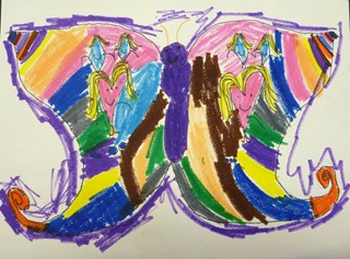 I asked my students to come to the white board to draw different ways to create the bottom of their butterfly wings. After that discussion, the kids drew the bottom of their wings and then set filling their wings with a matching pattern. Since we have already worked with simple shapes (e.g., circles, squares, etc.), I used basic shapes as the vehicle for creating symmetry on the butterflies. Students drew their designs, outlined them in Sharpie, and then used Crayola markers to color in their designs. I know many on the Web use paint for this type of project (particularly dot paint), but I wanted to use markers since it was a medium we had not used all year.
