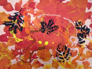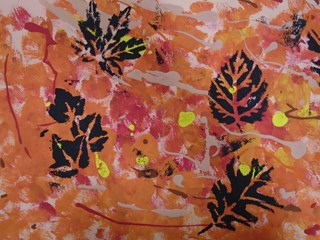 I had students select their own paper from a collection of Autumn-inspired, colored construction paper. We then took red, orange, and yellow tempera paint and used large brushes to ‘bunny hop’ around the paper. I wanted the background to show through so I recommended to the children that they leave some space. Some kids were very deliberate in their placement, others less so. Once the kids cycled through all three colors using the ‘bunny hop’ technique, we moved on to the next step.