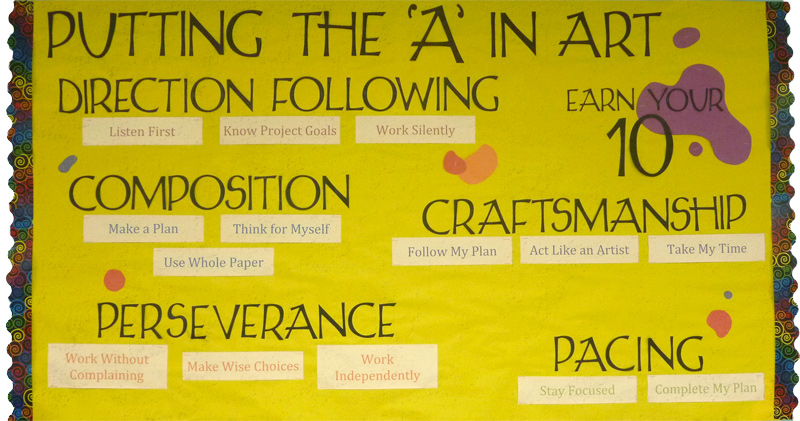 My “Putting the ‘A’ in Art” display helps students understand ways to think about their work and reflect upon their practice. (Click to Enlarge)